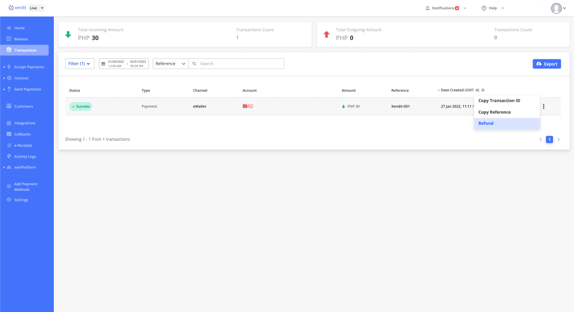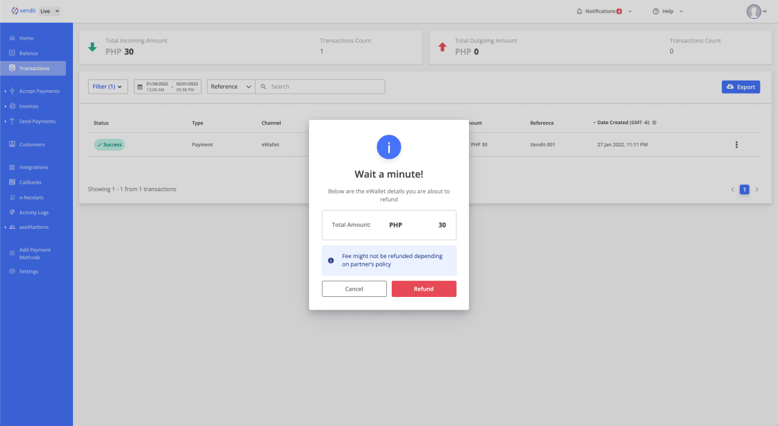 Merchant di Filipina juga dapat mengembalikan dana transaksi yang berhasil dibayar melalui Dasbor Xendit. Permintaan pengembalian dana penuh saat ini tersedia di bawah tab Transaksi