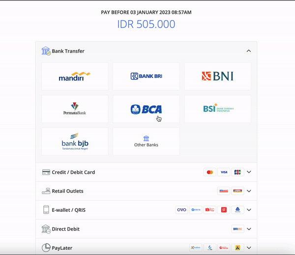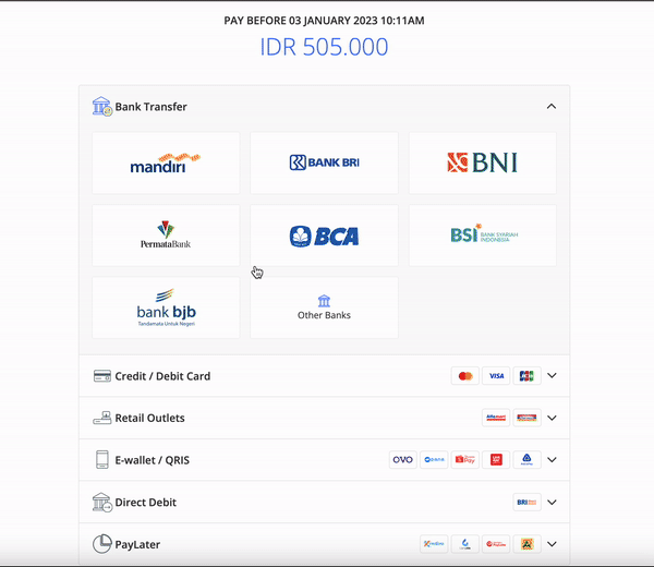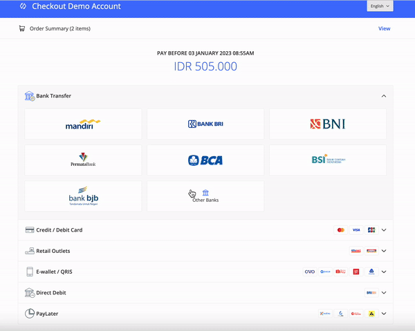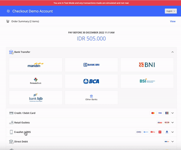 Menggunakan konektor tiruan Direct Debit untuk melakukan simulasi pembayaran dengan pengalaman yang lebih baik. Silakan mengikuti langkah berikut :