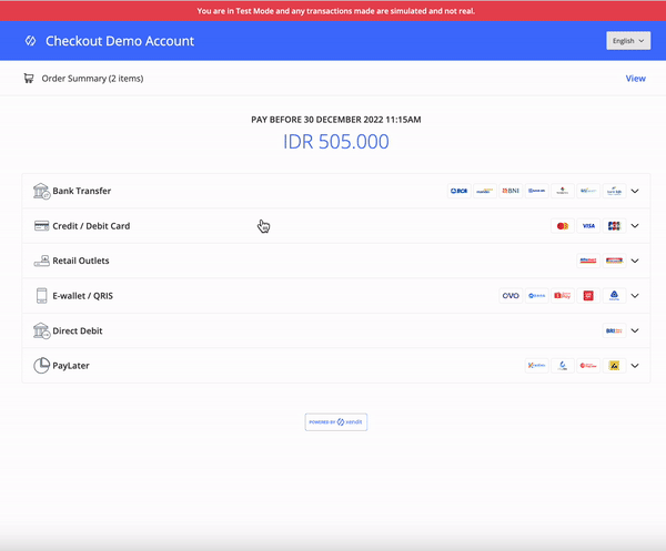 Anda dapat menggunakan nomor tiruan kami untuk melakukan simulasi dengan skenario yang berbeda. Silakan untuk dapat mengacu pada dokumentasi kami berikut untuk mempelajari lebih lanjut tentang skenario simulasi pada pembayaran kartu.