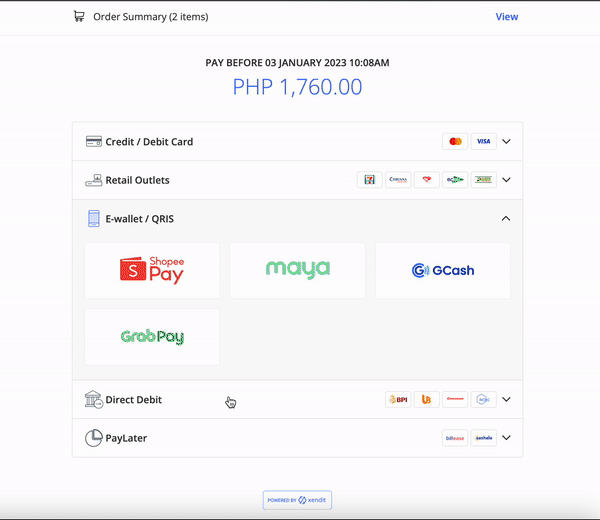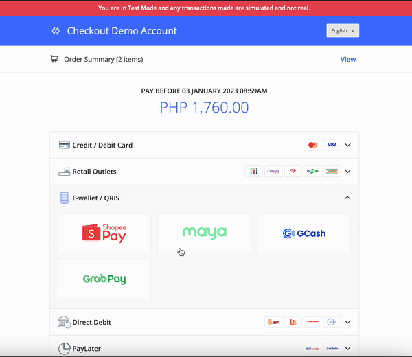 Terdapat dua pilihan untuk melakukan simulasi pembayaran Ewallet melalui tautan pembayaran untuk kanal Ewallet di Filipina :